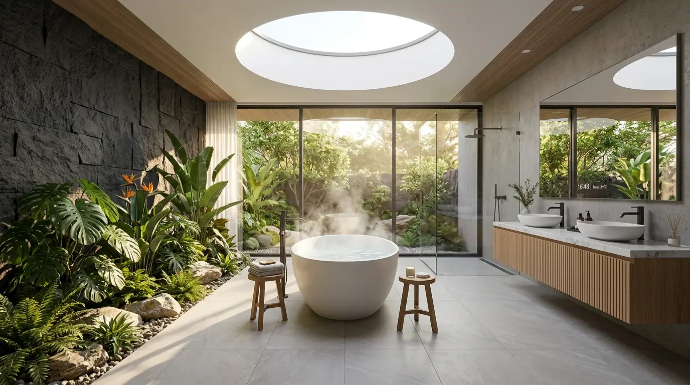 Imagine taking a shower while surrounded by lush ferns and trailing ivy. We’re seeing “wet rooms” that incorporate actual planter beds built into the floor or walls. The humidity from your shower makes it the perfect environment for tropical plants. It’s like having a private botanical garden that also happens to get you clean.