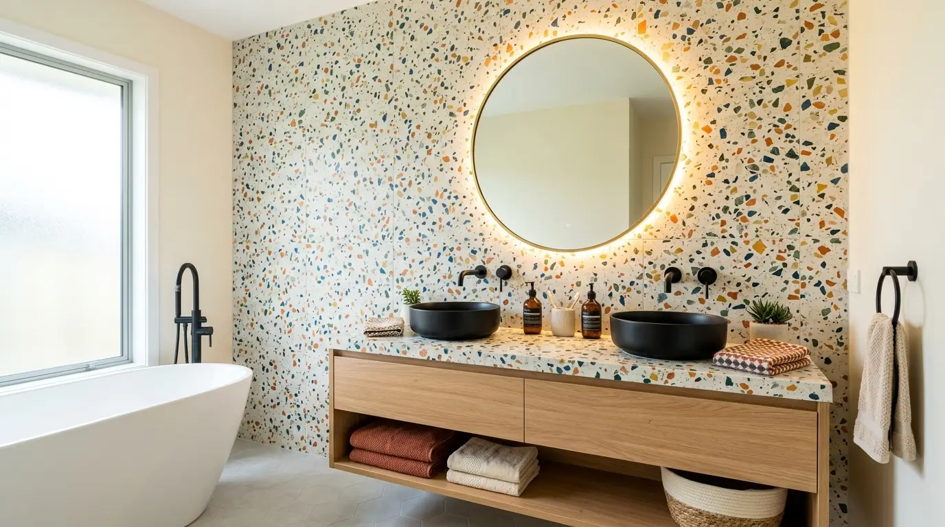 Terrazzo is back, but it’s not that muddy gray stuff from 1970s schools. Modern Terrazzo uses large chunks of marble, quartz, and even recycled glass in vibrant colors. It’s a way to add visual “noise” and personality to a floor or a vanity top without it feeling cluttered. Each slab is a unique piece of art.