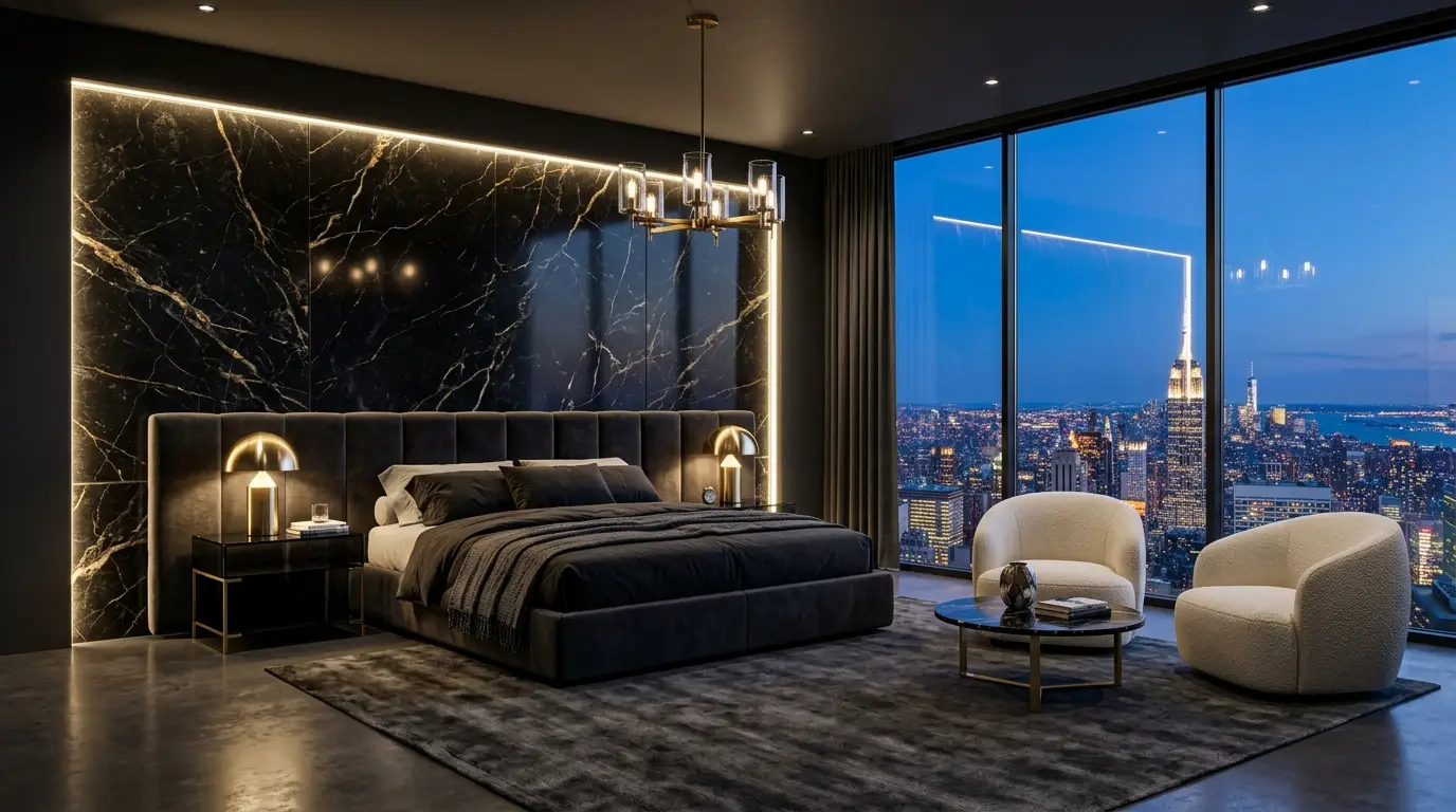 This design establishes the core Urban Luxe formula: balancing hard, architectural surfaces with ultra-plush comfort. It’s the ultimate “power bedroom.”
