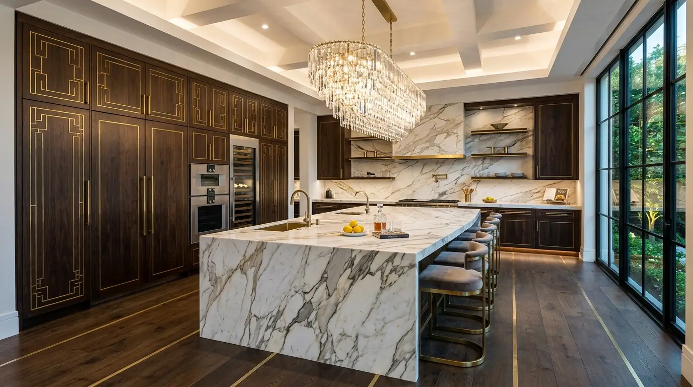 Invest in “Touch”: Opulence isn’t just visual; it’s tactile. Use heavily veined natural stones, fluted woods, or matte “velvet-touch” cabinetry finishes to make every surface feel incredibly expensive.