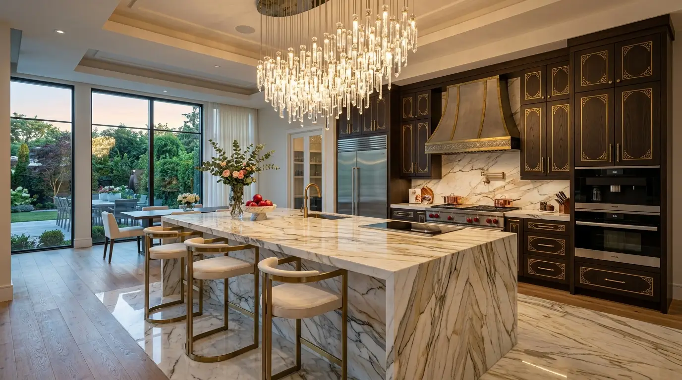Scale Your Lighting: In a luxury kitchen, your chandelier should be a statement, not an afterthought. Don’t be afraid to go big. A fixture that spans at least a third of your island’s length will provide that high-end, dramatic scale.