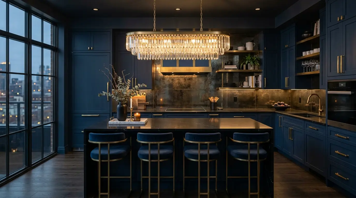 A sophisticated kitchen with deep blue cabinetry and gold accents is illuminated by a large, elegant crystal chandelier. The central island features four blue and gold stools, while a vase with dried branches and a lit candle add a cozy touch. Large windows on the left offer a cityscape view, enhancing the room’s modern ambiance.