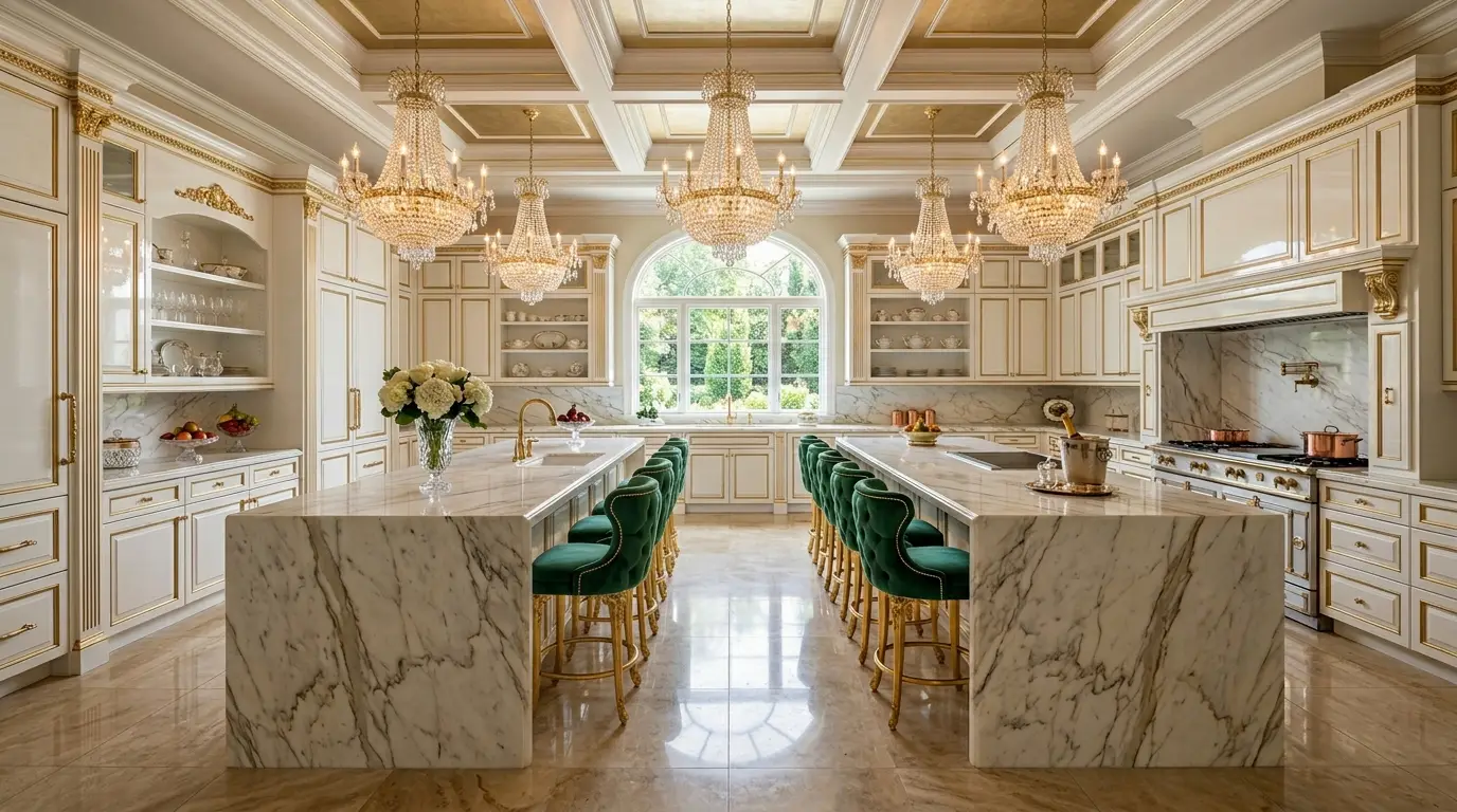 A luxurious kitchen features ornate chandeliers hanging from a coffered ceiling, with two large marble islands surrounded by elegant green velvet bar stools. The room is adorned with gold accents and large windows offering a view of a manicured garden.