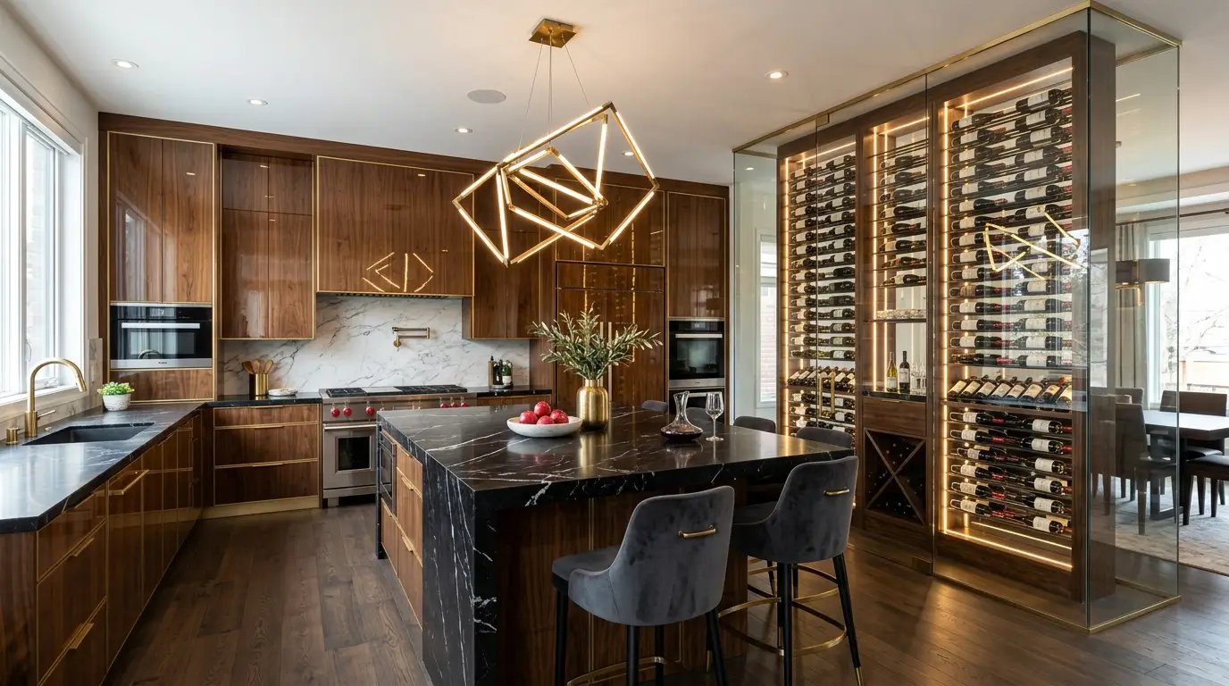 This kitchen integrates high-end lifestyle directly into the architecture. The glowing, temperature-controlled wine wall serves as an intricate, functional backdrop. The rich walnut and black Marquina marble provide a dark, sophisticated canvas that lets the wine display and brass chandelier truly shine.