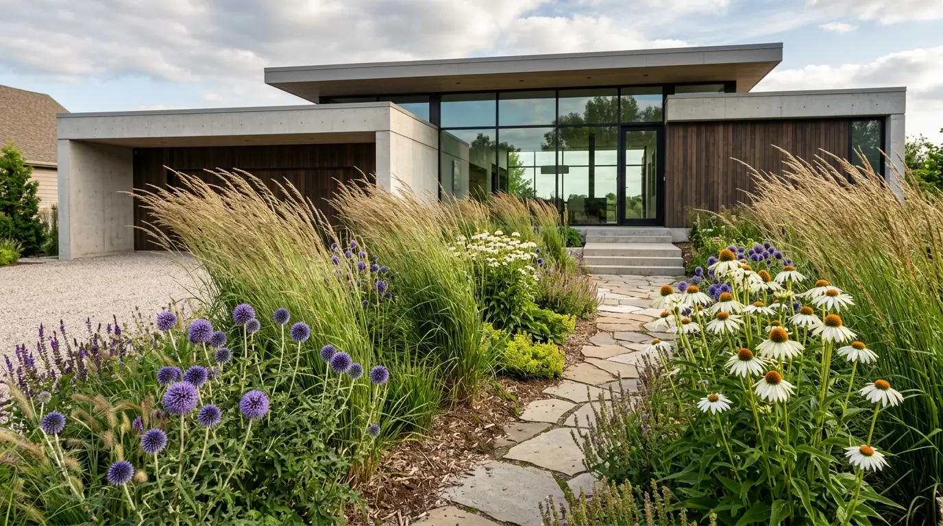 When the wind blows, a modern house stands perfectly still, but a garden of Mexican Feather Grass or Karl Foerster grass ripples like the ocean. Interplanting these grasses with bold, structural flowers like tall Coneflowers or Globe Thistle creates a dynamic tension. The rigidity of the architecture contrasts beautifully with the wild, kinetic energy of the planted layers.