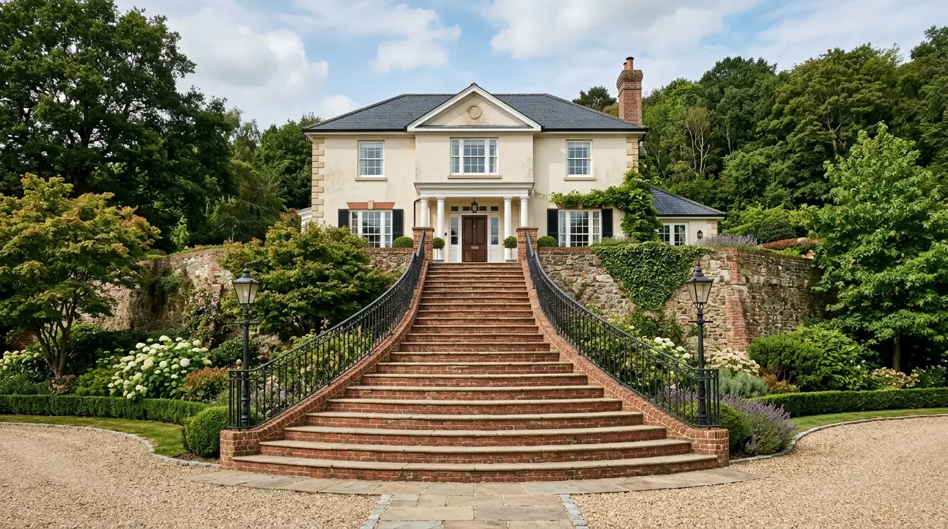 A narrow, winding, chaotic garden path makes an entrance feel quaint and cottage-like—which makes the house look small. For a massive impact, use formal, highly structured landscaping. Think of a wide, straight brick pathway lined with perfectly symmetrical, manicured boxwood hedges leading directly to the front door. This plays with forced perspective, making the approach feel like the grand entrance to a historic estate.