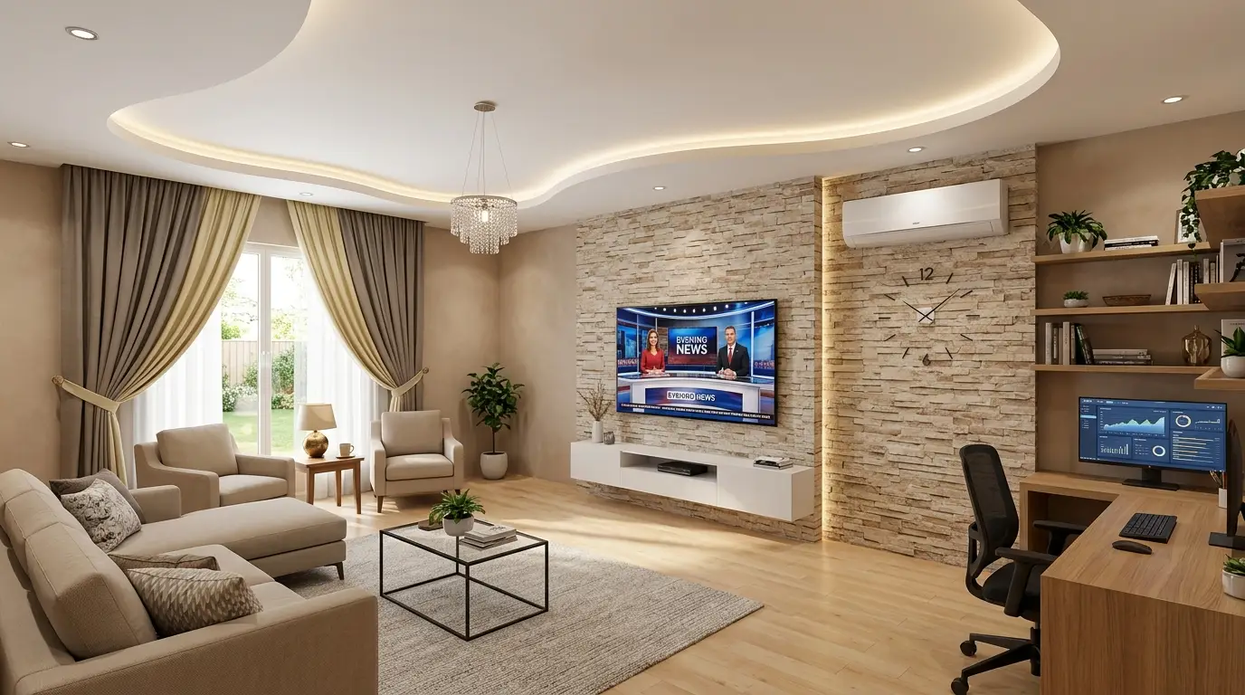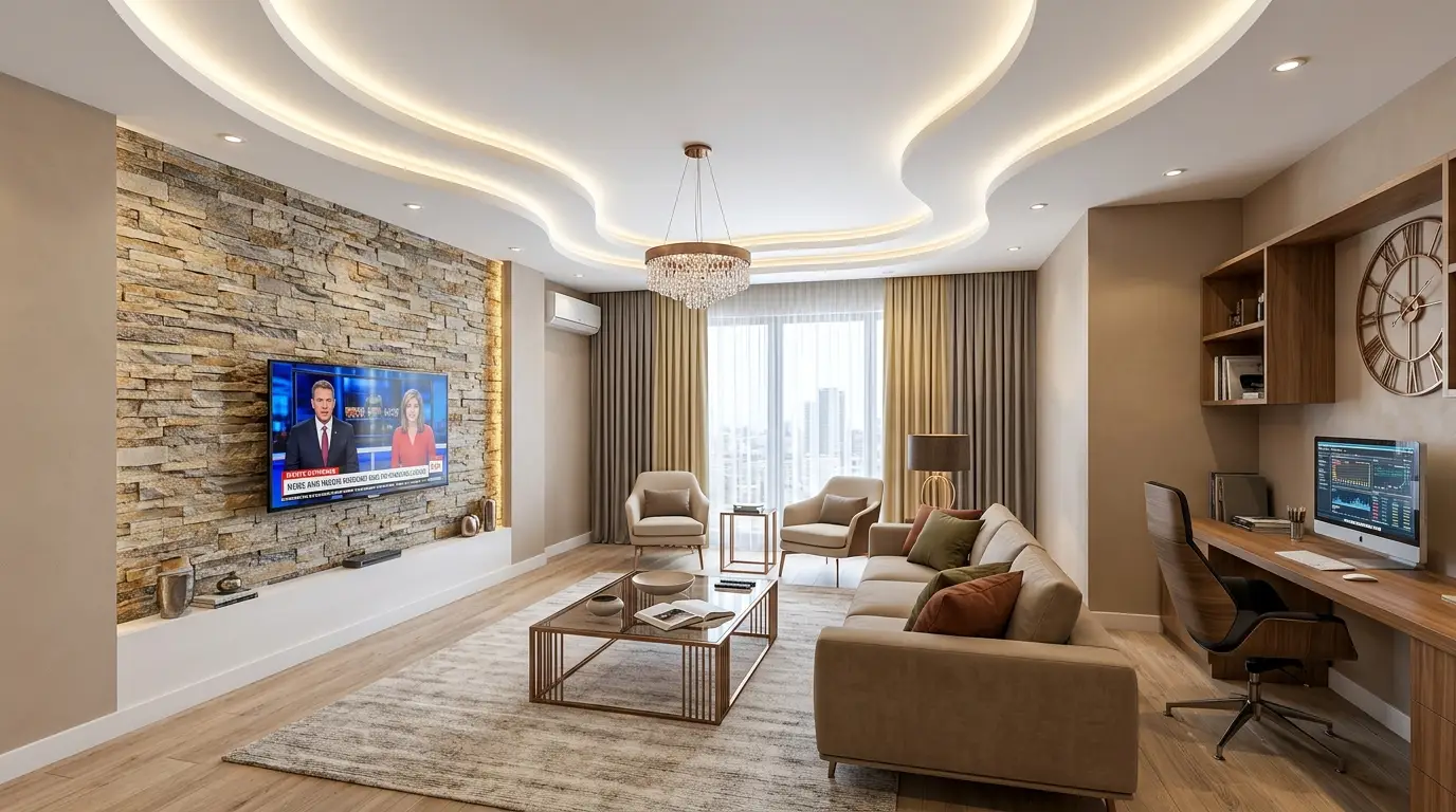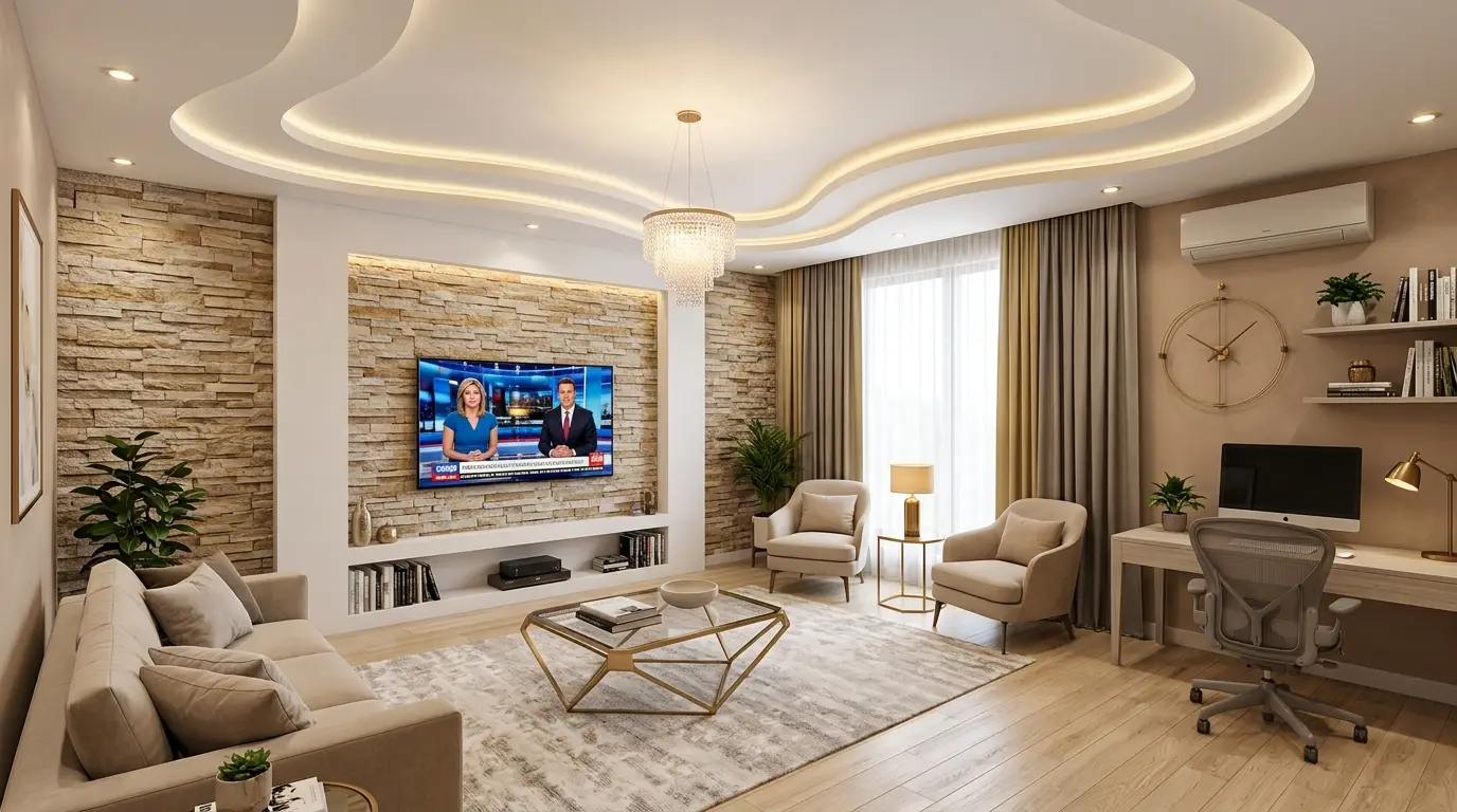 In today’s fast-paced world, our homes need to work harder than ever, and the concept of the single-use living room is officially dead. The hottest trend in interior design right now is the “Modern Multi-Functional Living Room”—spaces that seamlessly blend high-end entertainment, supreme relaxation, and dedicated productivity without sacrificing an ounce of style. This aesthetic is defined by its warm, curated atmosphere, utilizing complex architectural features like flowing white false ceilings with integrated LED lighting, textured tan and brown stack-stone media walls, and sophisticated dedicated workspaces tucked perfectly into the layout. In this ultimate gallery guide, we will explore 18 distinct variations of this breathtaking, highly styled aesthetic to inspire your next major home renovation.