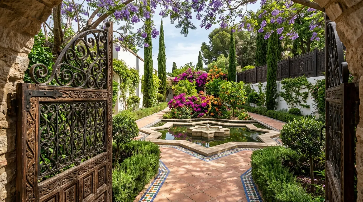 First impressions dictate the entire spatial experience. This layout emphasizes the entrance to the courtyard by introducing an intricate wrought iron and carved wood gate along the terracotta path. Passing through this ornate threshold officially transitions the visitor from the outside world into the private, perfectly curated Andalusian sanctuary, framing the central water feature beautifully.