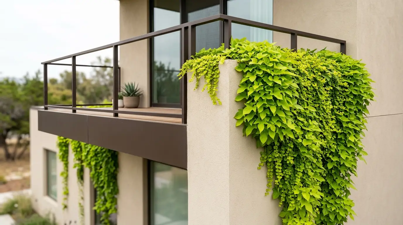 The Spiller: Trailing vines or cascading flowers that tumble over the edge of the planter, softening the hard lines of the balcony.
