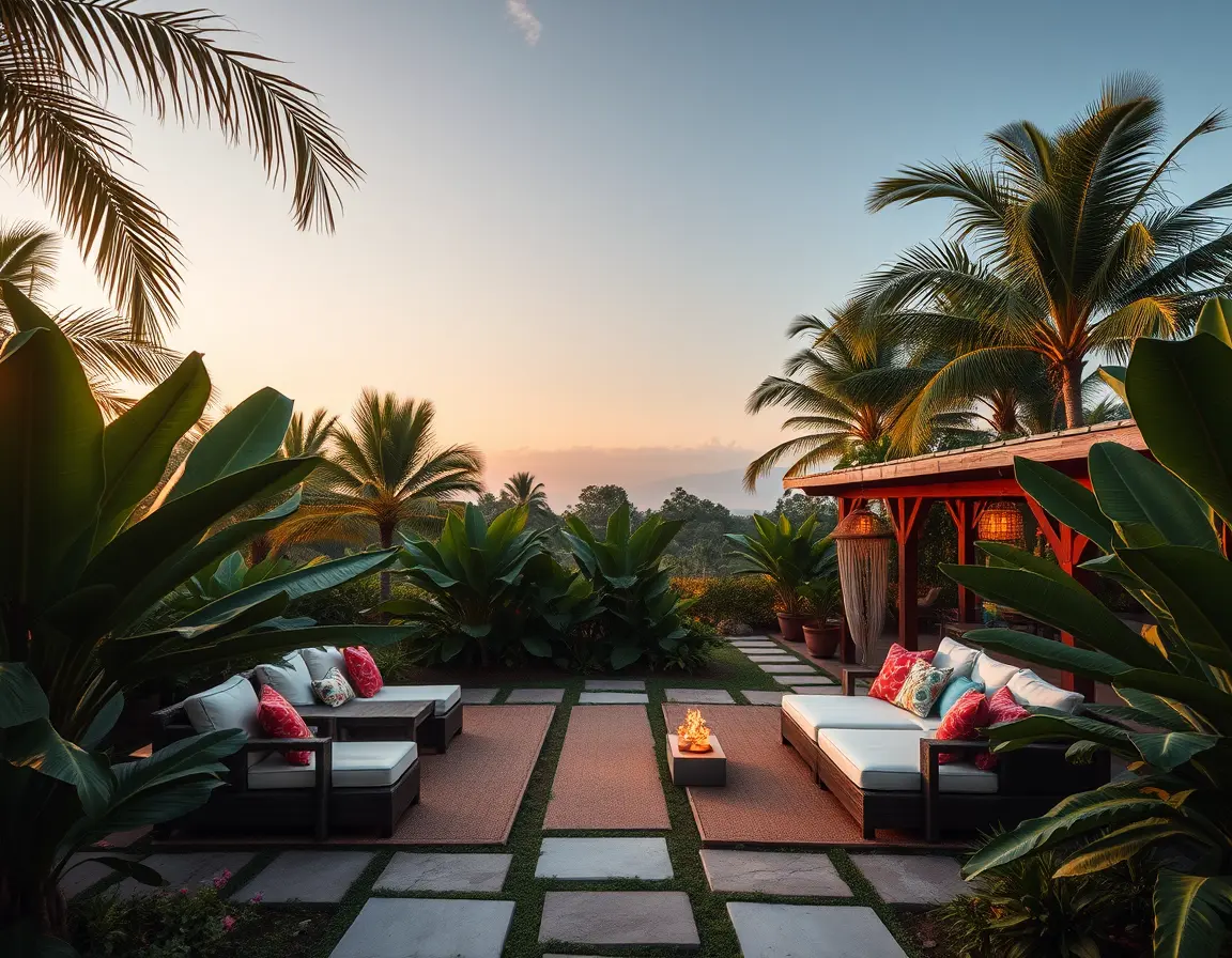 To evoke a sense of vacation and relaxation, tropical paradises are ideal for those looking to create a lush, vibrant outdoor space. Key landscape design elements include curved pathways, tiki torches, and outdoor lounges that invite enjoyment. For plant selection, focus on large-leafed plants such as monstera, hibiscus, and palm trees that provide a tropical feel. To enhance the theme, consider decor ideas like colorful outdoor cushions, hammocks, and decorative water features that mimic the sounds of nature.