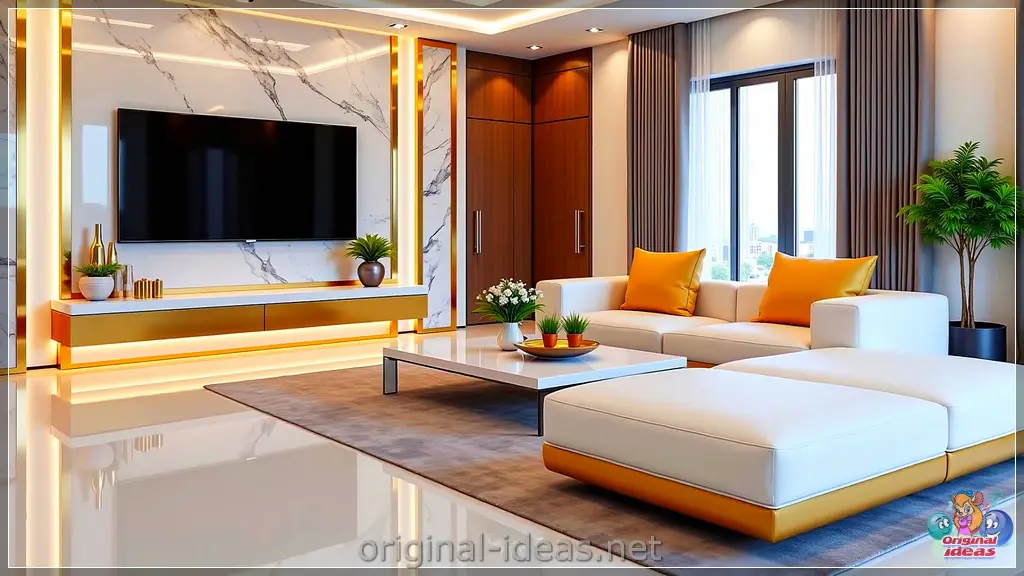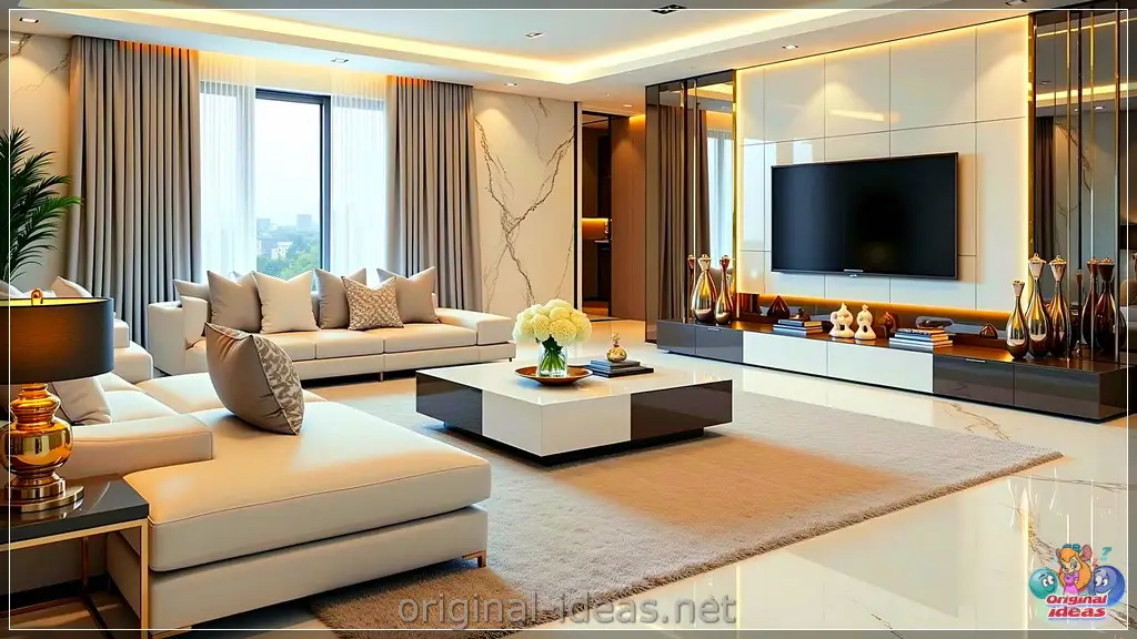 Layer 2 (Texture): Velvet sofa + wool rug + metallic table + marble or wood wall unit.