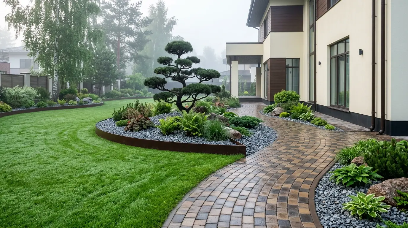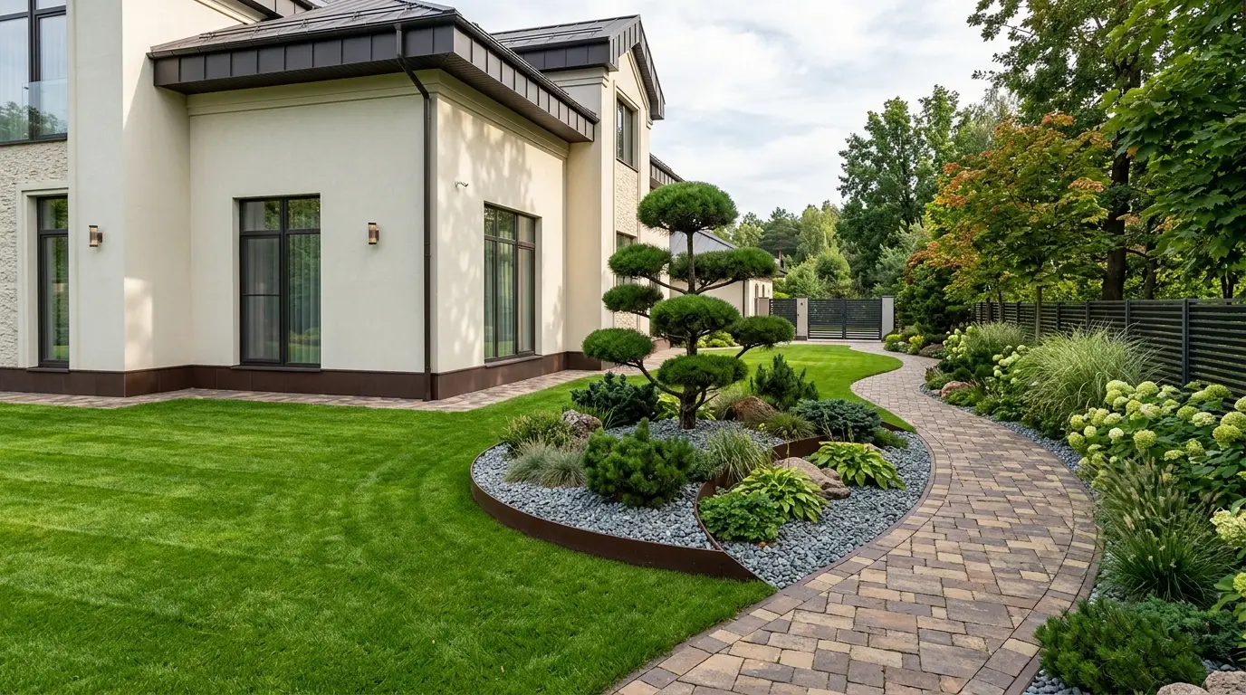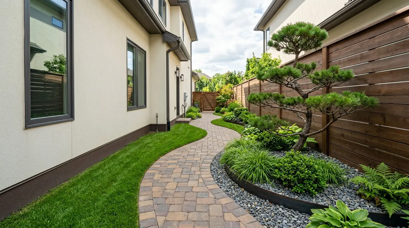 Zu lange wurden die schmalen Grundstücksgrenzen neben unseren Häusern vernachlässigt und zu ungenutzten Flächen oder verwilderten Abstellflächen degradiert. Heute erobert die moderne Landschaftsgestaltung diese vernachlässigten Bereiche zurück und verwandelt sie in weitläufige, durchgehende Landschaftswege, die Vorder- und Rückseite des Grundstücks miteinander verbinden. Diese begehrte Ästhetik – perfekt gepflegter, leuchtend grüner Rasen kombiniert mit dynamischen, geschwungenen Pflastersteinen – löst das Problem ungenutzter Seitenflächen und steigert gleichzeitig den Wert der Immobilie. Indem sie ein hellcremefarbenes Haus mit dunkelbraunen Akzenten vor der markanten, eleganten Silhouette eines stilisierten Niwaki-Baumes und grauen Steinen als Bodendecker in Szene setzt, bietet Ihnen diese Galerie die perfekte Vorlage für eine atemberaubende Umgestaltung Ihres Seitengartens.