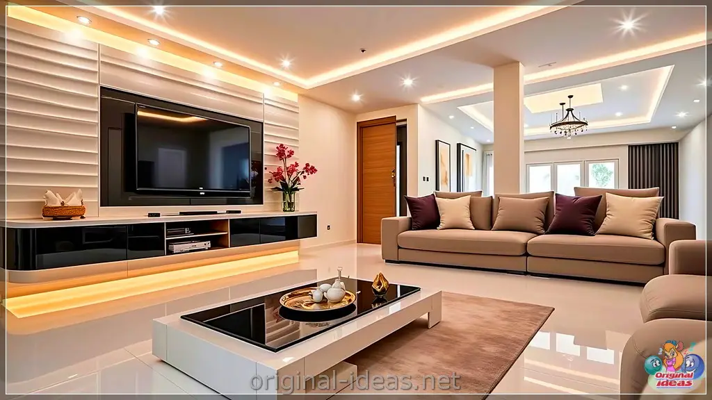 Gegenüber dem Sofa sorgt ein eleganter, an der Wand montierter Fernseher für ein aufgeräumtes Erscheinungsbild und unterstreicht die klaren Linien des Raumes. Diese Anordnung maximiert die Bodenfläche und bietet gleichzeitig ein perfektes Seherlebnis für entspannte Filmabende oder ungezwungene Treffen.