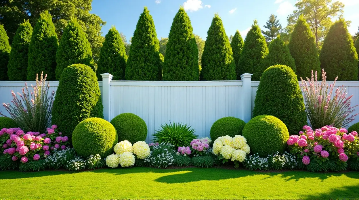 Ein wunderschön angelegter Garten besticht durch vier hohe, kegelförmige immergrüne Bäume, die von üppigen Hortensiensträuchern mit weißen Blüten umgeben sind. Der sattgrüne Rasen und ein weißer Zaun bilden eine ruhige Kulisse, während Ziergräser und violette Blumen für Farbtupfer und Struktur sorgen.