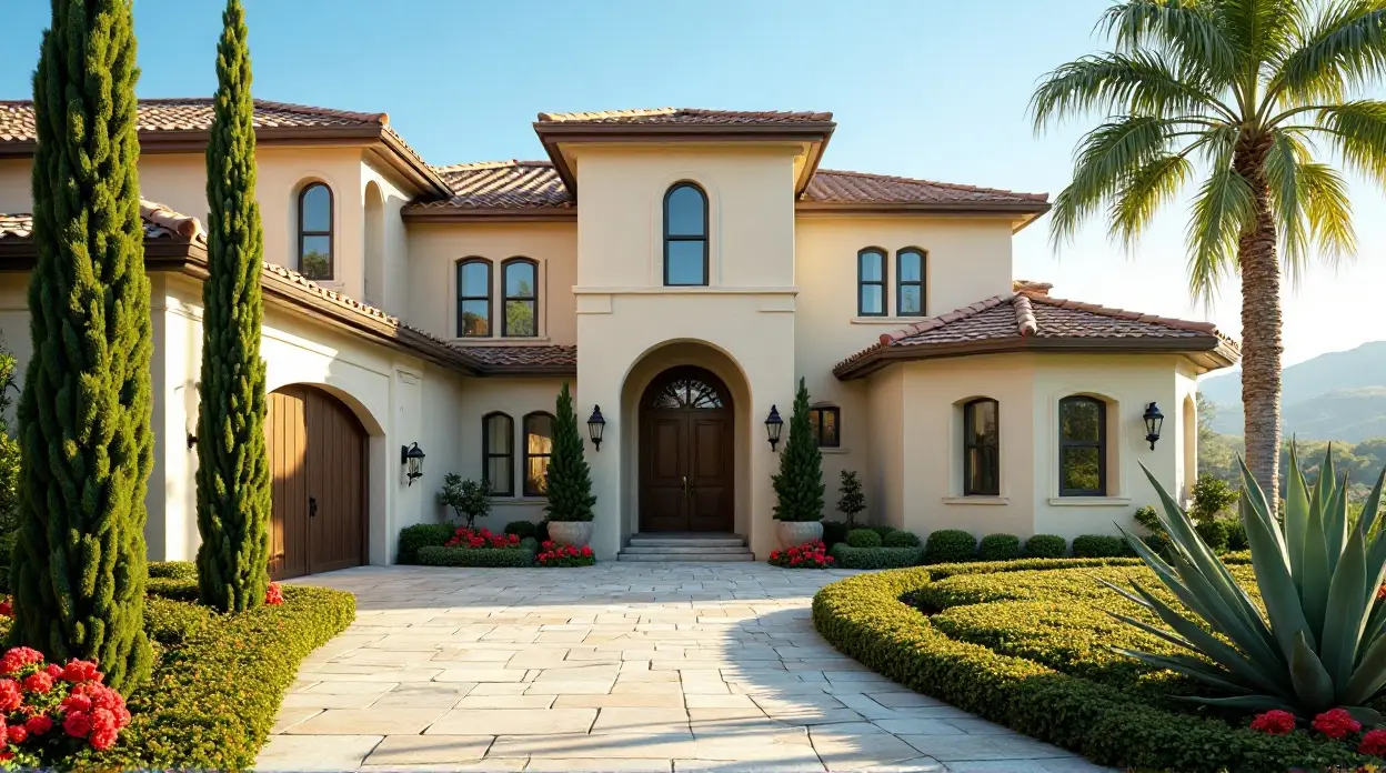 Una lujosa villa de estilo mediterráneo cuenta con una imponente puerta de entrada de madera flanqueada por altos y esbeltos cipreses. La fachada está adornada con un techo de tejas de terracota y una elegante mampostería. El cuidado jardín incluye arbustos cuidadosamente podados y vibrantes flores rojas que bordean el sendero de piedra que conduce a la entrada.