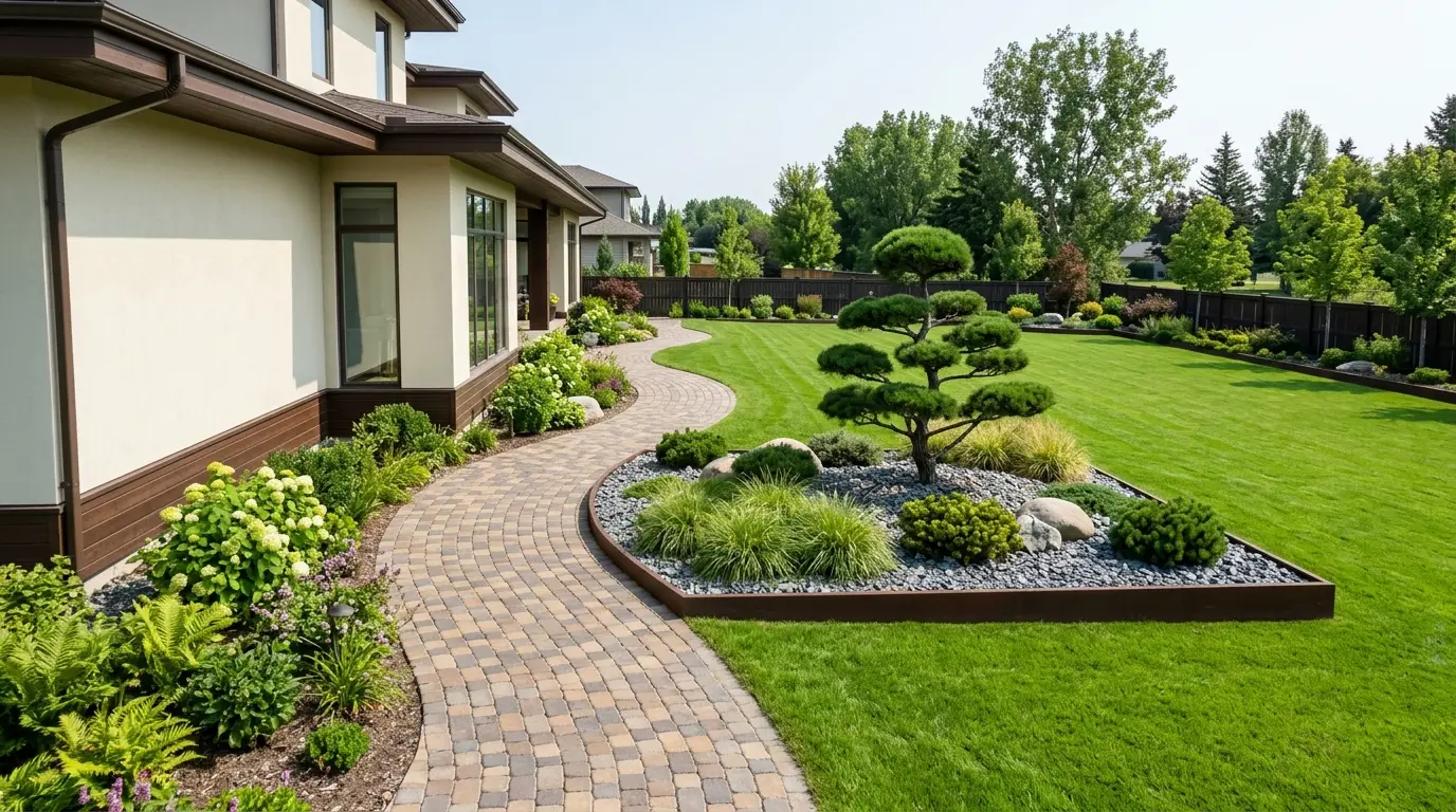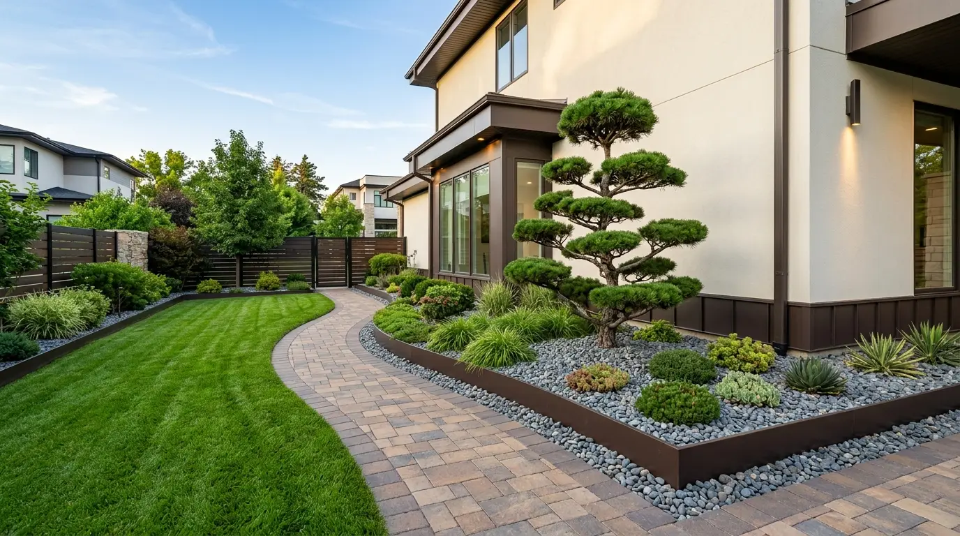 Même les terrains les plus exigus peuvent accueillir ce style haut de gamme. Dans les zones plus étroites, l’allée de pierre domine l’espace, offrant une surface propre et praticable qui ne nécessite aucune tonte. Une fine bande de gazon parfaitement entretenue et un parterre de pierres judicieusement placé préservent la verdure sans surcharger l’espace.