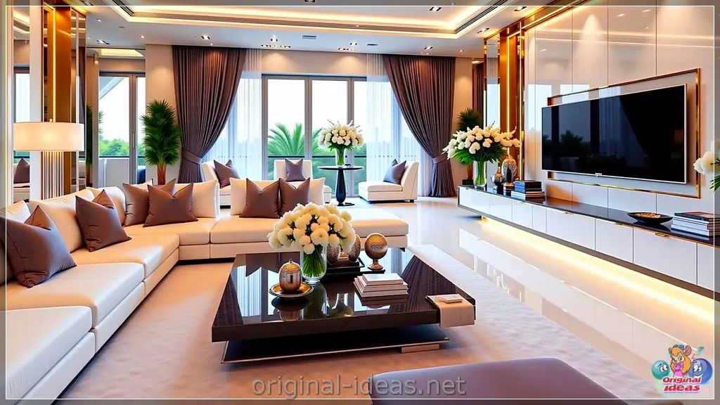 Un salon moderne au design épuré est meublé d’un grand canapé d’angle beige orné de coussins noirs et beiges. Une table basse noire laquée accueille objets décoratifs et livres. La pièce comprend un coin repas avec des chaises noires et un grand tableau abstrait accroché au mur. De hautes plantes et d’élégants vases de fleurs blanches apportent une touche de verdure.Un salon luxueux est meublé d’un grand canapé d’angle blanc orné de nombreux coussins beiges et blancs. Devant le canapé, une table basse noire laquée accueille des objets décoratifs et un vase de fleurs blanches. La pièce est élégamment éclairée par des spots encastrés, et une grande œuvre d’art représentant des branches d’arbre est accrochée au mur. De hautes fenêtres habillées de rideaux beiges et de plantes en pot contribuent à l’ambiance raffinée.Un salon luxueux est meublé d’élégants canapés blancs ornés de coussins bleus et gris. Une table basse épurée accueille un vase de fleurs blanches, en harmonie avec le décor moderne de la pièce. De grandes fenêtres aux rideaux bleus laissent entrer la lumière naturelle, et une bibliothèque ainsi qu’une plante en pot apportent une touche de raffinement supplémentaire.Un salon luxueux est meublé de canapés blancs épurés, ornés de coussins gris moelleux, disposés autour d’une table basse noire laquée. La pièce est élégamment décorée de grandes compositions florales et d’éléments modernes, tandis qu’un téléviseur grand écran est fixé sur un meuble mural design. De grandes fenêtres aux rideaux occultants laissent entrer la lumière naturelle, contribuant à l’ambiance raffinée.Un salon moderne et élégant est meublé d’un canapé d’angle blanc aux coussins gris, d’une table basse noire laquée et d’un grand téléviseur à écran plat fixé sur un meuble mural épuré. L’espace est éclairé par des spots encastrés à la lumière chaude et un lustre remarquable, tandis que des vases décoratifs et des fleurs apportent une touche de raffinement.Un salon luxueux est meublé d’un grand canapé d’angle blanc aux coussins moelleux, d’une élégante table basse noire et d’une télévision fixée au mur. D’élégants lustres ornent le plafond, et l’espace est agrémenté de vases décoratifs et de plantes vertes luxuriantes. La pièce est baignée de lumière naturelle grâce aux grandes fenêtres.Un salon moderne est doté d’un élégant meuble TV avec un grand écran plat, entouré d’étagères éclairées où sont exposés des objets décoratifs. Un canapé blanc moelleux aux coussins gris est placé à proximité, complété par une table basse noire laquée ornée de vases de fleurs. De hautes fenêtres aux voilages laissent entrer la lumière naturelle, contribuant à l’atmosphère raffinée de la pièce.