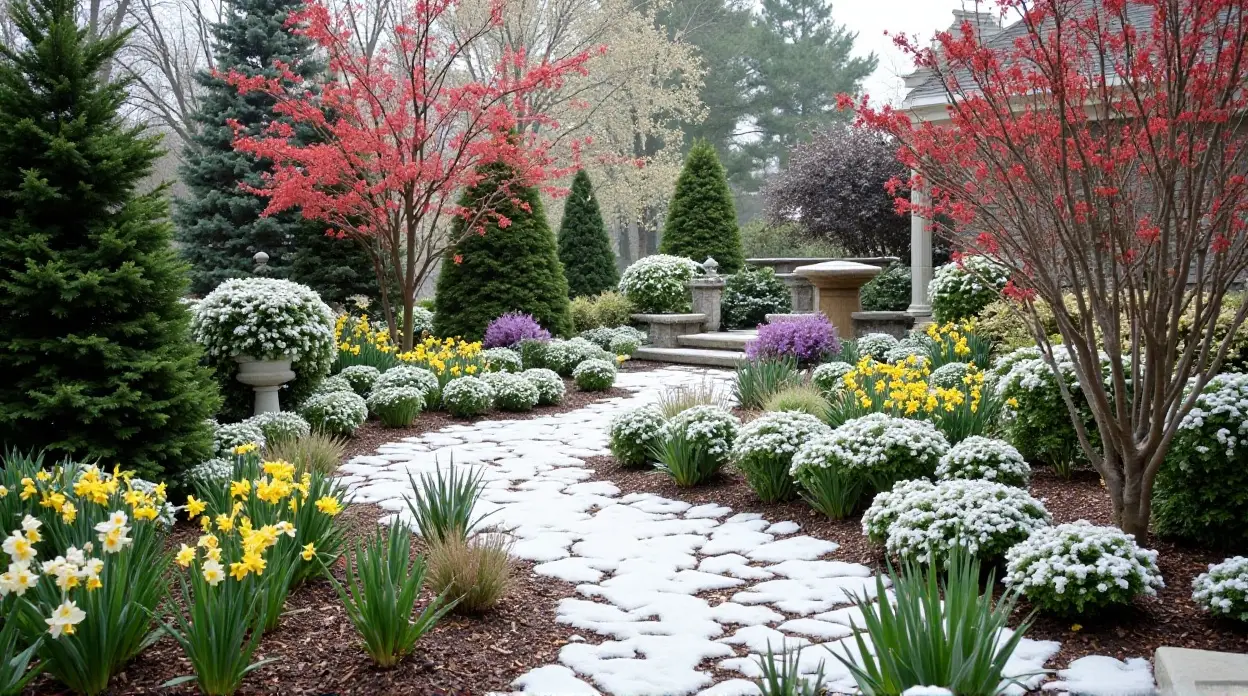 - Aménagements extérieurs : Pensez à utiliser des allées en pierre, des patios et des murs de soutènement qui offrent un intérêt visuel même en hiver.