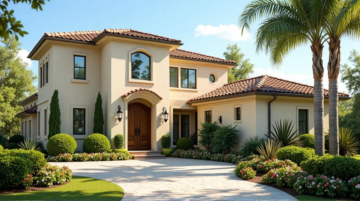 Une maison de style méditerranéen, aux tons beiges chauds à l’extérieur et au toit en tuiles de terre cuite, est entourée d’une végétation luxuriante, comprenant des buissons soigneusement taillés et des palmiers éclatants, sous un ciel d’un bleu limpide.