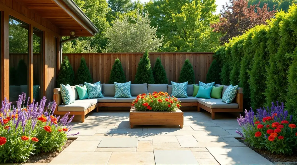 Un patio de jardin accueillant est agrémenté d’un confortable canapé d’angle en forme de L, orné de coussins crème et de coussins bleu vif à motifs. L’espace est entouré d’une végétation luxuriante, notamment de hautes haies et de plantes fleuries aux nuances de violet et de rouge. Une jardinière en bois au centre met en valeur des fleurs de lavande, contribuant à l’atmosphère sereine.