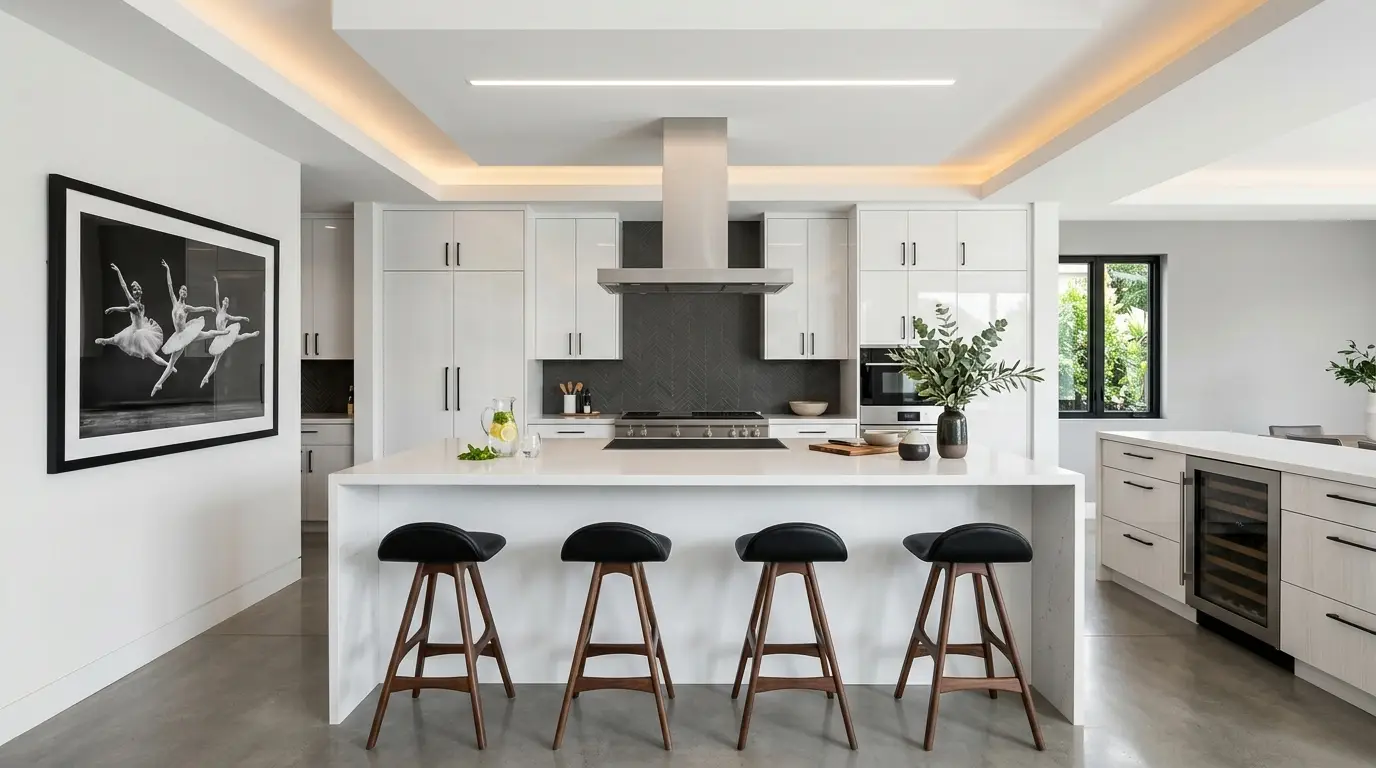 Una cucina moderna presenta un’elegante isola bianca con quattro sgabelli neri, una cappa in acciaio inox e mobili minimalisti. Una grande foto in bianco e nero di ballerini adorna la parete, mentre le piante in vaso aggiungono un tocco di freschezza. La luce naturale che filtra da una finestra mette in risalto il design pulito e contemporaneo.