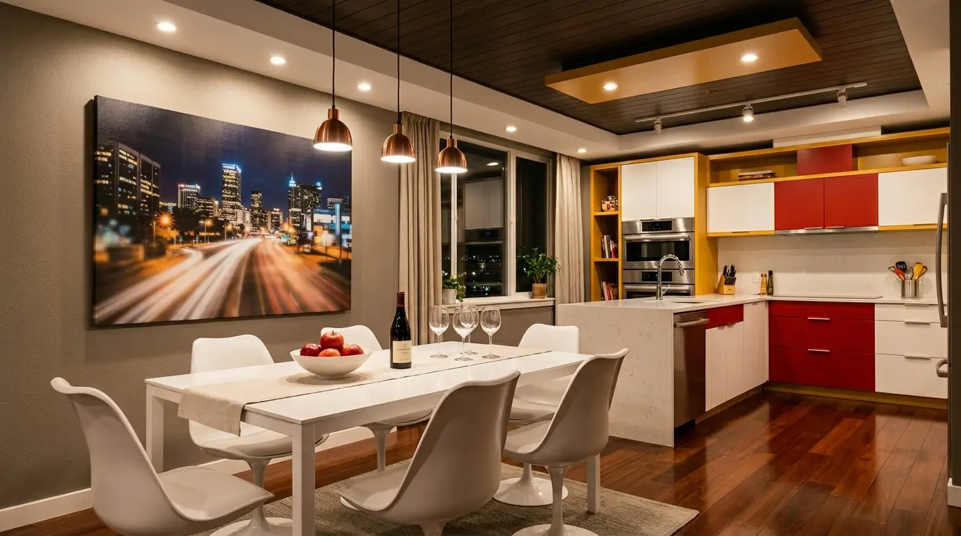 Una moderna zona pranzo con un elegante tavolo bianco per quattro persone, completo di bottiglia di vino e bicchieri. La stanza è illuminata da lampade a sospensione e decorata con un grande dipinto raffigurante uno scenario urbano sulla parete. La cucina adiacente presenta mobili rossi e bianchi, elettrodomestici in acciaio inossidabile e un piano di lavoro in marmo.