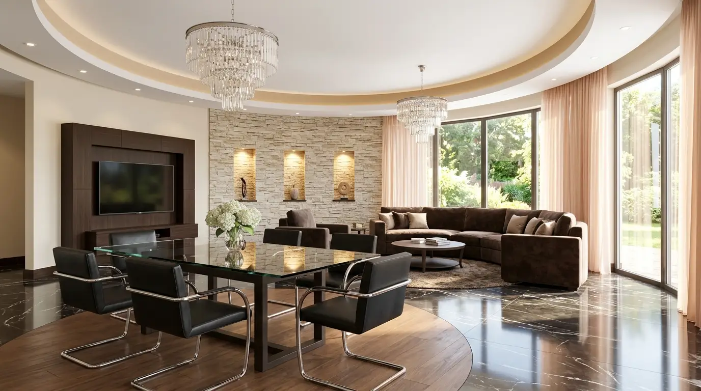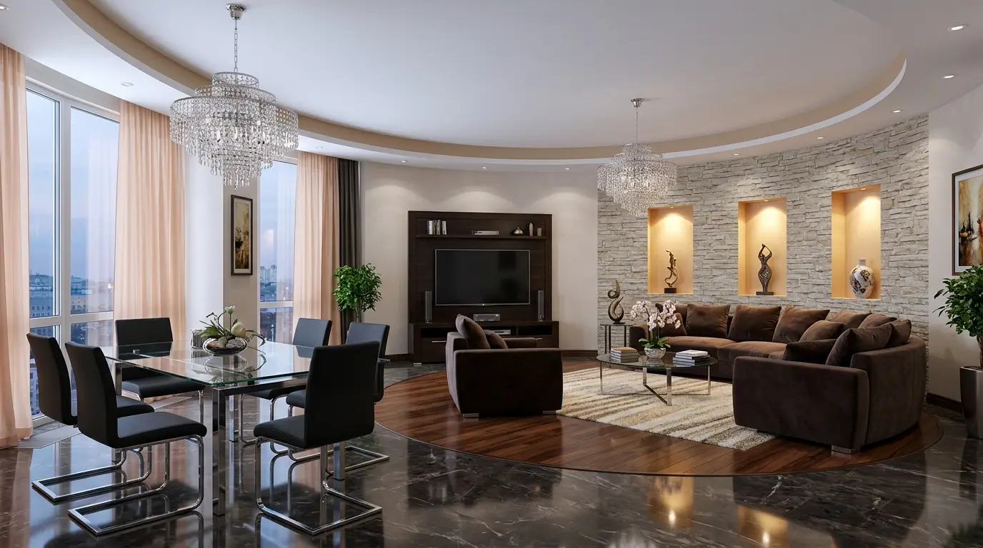 Un lussuoso soggiorno con zona pranzo è arredato con un grande divano angolare marrone su un pavimento circolare in legno, un tavolino da caffè in vetro e sculture decorative su una parete con rivestimento in pietra. Un tavolo da pranzo in vetro con sedie nere si trova nelle vicinanze, sotto uno scintillante lampadario. Ampie finestre con tende trasparenti garantiscono un’abbondante luce naturale.
