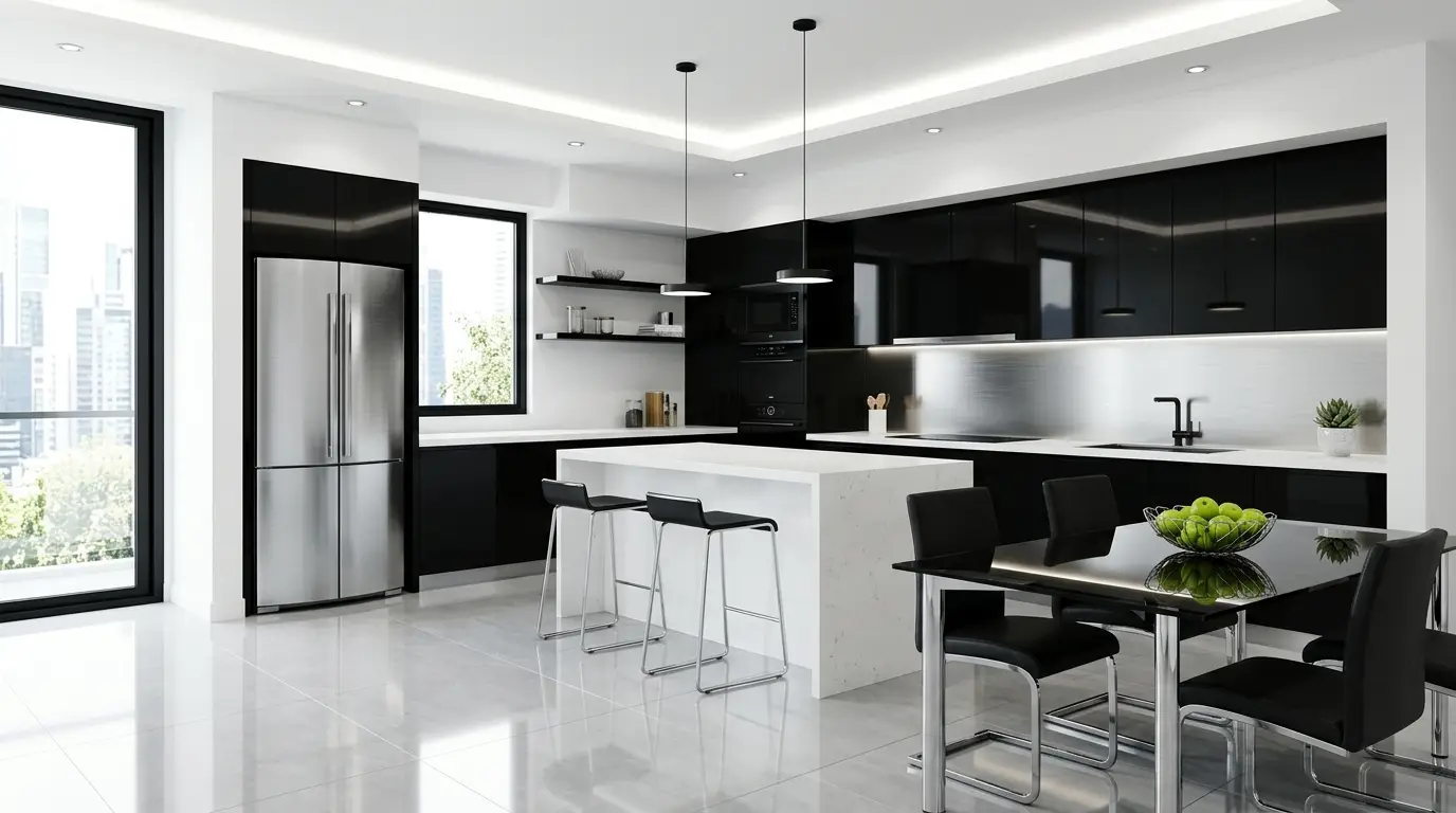 Una cucina moderna con eleganti mobili neri e un frigorifero in acciaio inox. Un’isola bianca con sgabelli neri occupa la posizione centrale, mentre un tavolo da pranzo in vetro con sedie nere abbinate si trova nelle vicinanze. Le ampie finestre permettono alla luce naturale di inondare lo spazio, mettendo in risalto il pavimento piastrellato lucido e le mele verdi in una ciotola sul tavolo.