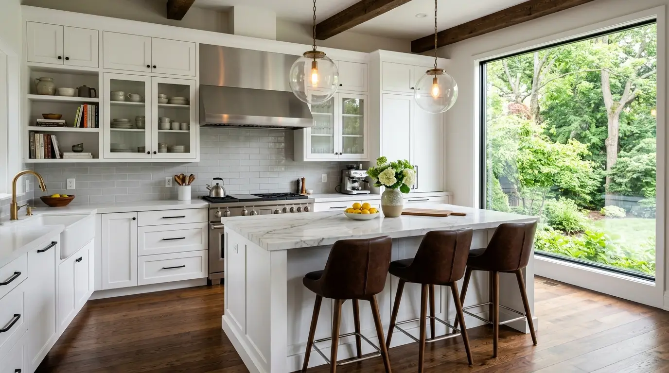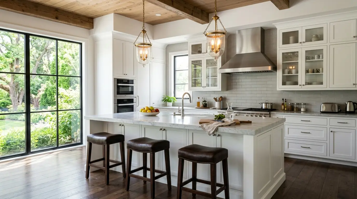 Una cucina moderna in stile transizionale, caratterizzata da mobili bianchi in stile shaker, una grande isola con piano a cascata in marmo bianco, sgabelli da bar in pelle scura, travi a vista in legno di recupero e un’enorme finestra che si affaccia su un giardino rigoglioso.