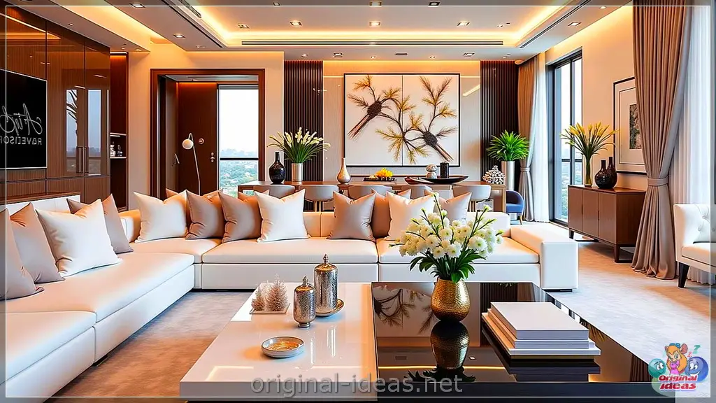 Nowoczesny salon o eleganckim wystroju z dużą beżową sofą modułową ozdobioną czarnymi i beżowymi poduszkami. Lśniący, czarny stolik kawowy mieści dekoracje i książki. W salonie znajduje się jadalnia z czarnymi krzesłami i dużym, abstrakcyjnym obrazem na ścianie. Wysokie rośliny i eleganckie wazony z białymi kwiatami dodają odrobinę zieleni.Luksusowy salon z dużą, białą sofą modułową ozdobioną licznymi beżowymi i białymi poduszkami. Przed sofą, na lśniącym, czarnym stoliku kawowym, znajdują się dekoracje i wazon z białymi kwiatami. Pokój jest elegancko oświetlony oświetleniem wpuszczanym, a na ścianie wisi duży obraz przedstawiający gałęzie drzew. Wysokie okna z beżowymi zasłonami i roślinami doniczkowymi podkreślają wyrafinowaną atmosferę.Luksusowy salon zdobią eleganckie białe sofy ozdobione niebieskimi i szarymi poduszkami. Elegancki stolik kawowy mieści wazon z białymi kwiatami, uzupełniając nowoczesny wystrój pokoju. Duże okna z niebieskimi zasłonami wpuszczają naturalne światło do wnętrza, a regał z książkami i doniczka z rośliną dodają mu elegancji.Luksusowy salon z eleganckimi białymi sofami ozdobionymi pluszowymi szarymi poduszkami, ustawionymi wokół lśniącego, czarnego stolika kawowego, zdobią eleganckie białe sofy z dużymi kompozycjami kwiatowymi i nowoczesnymi akcentami, a na stylowej meblościance zamontowano telewizor panoramiczny. Duże okna z ciemnymi zasłonami wpuszczają do wnętrza naturalne światło, podkreślając wyrafinowaną atmosferę.Nowoczesny, elegancki salon wyposażony jest w białą sofę modułową z szarymi poduszkami, lśniący czarny stolik kawowy oraz duży telewizor z płaskim ekranem zamontowany na eleganckiej szafce ściennej. Przestrzeń oświetlają ciepłe, wpuszczane oświetlenie i efektowny żyrandol, a dekoracyjne wazony i kwiaty dodają odrobinę elegancji.Luksusowy salon wyposażony jest w dużą białą sofę modułową z miękkimi poduszkami, elegancki czarny stolik kawowy i telewizor zamontowany na ścianie. Z sufitu zwisają eleganckie żyrandole, a przestrzeń zdobią ozdobne wazony i bujne, zielone rośliny. Pokój jest jasno oświetlony naturalnym światłem wpadającym przez duże okna.Nowoczesny salon wyposażony jest w eleganckie centrum rozrywki z dużym telewizorem z płaskim ekranem, otoczonym podświetlanymi półkami z dekoracyjnymi przedmiotami. Obok stoi miękka biała sofa z szarymi poduszkami, a obok lśniący czarny stolik kawowy ozdobiony wazonami z kwiatami. Wysokie okna z delikatnymi zasłonami wpuszczają do wnętrza naturalne światło, podkreślając elegancki klimat wnętrza.