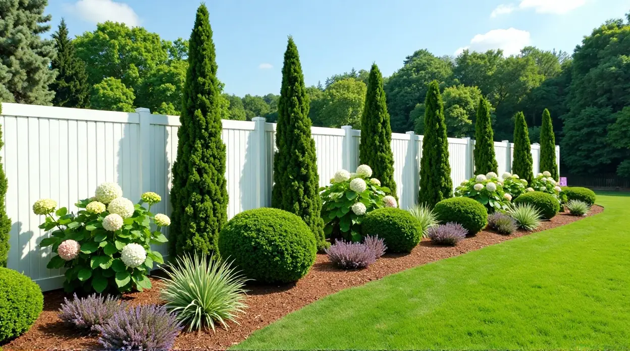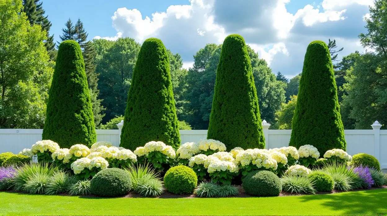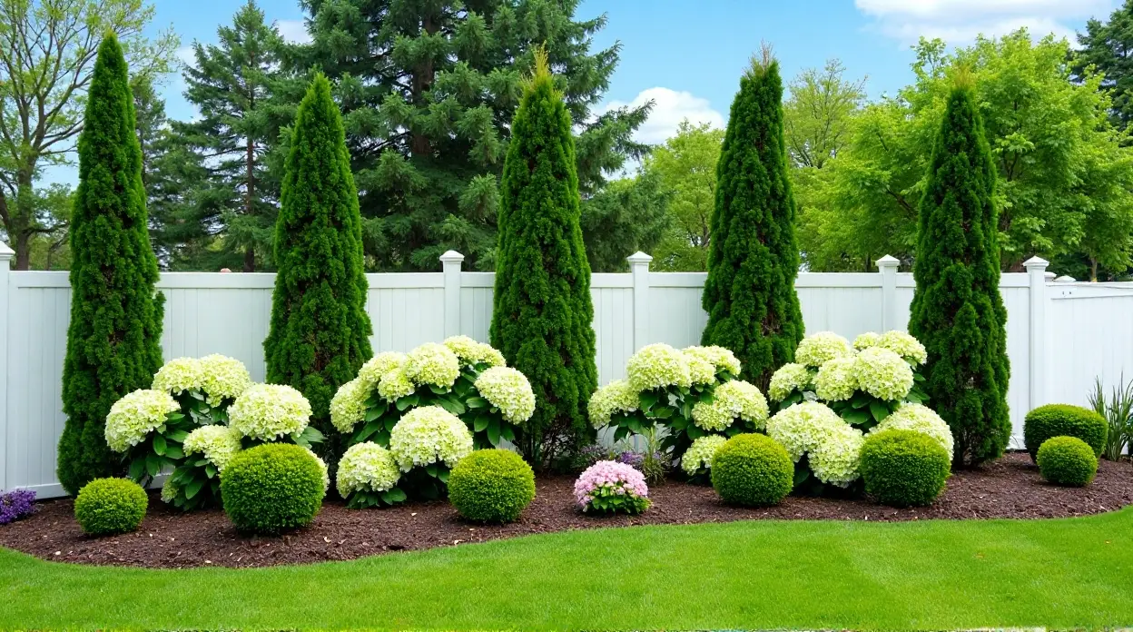Starannie zagospodarowany ogród z czterema wysokimi, smukłymi, wiecznie zielonymi drzewami, ustawionymi wzdłuż białego płotu. Przed nim rosną bujne krzewy hortensji o białych kwiatach i okrągłe, zadbane krzewy. Soczysta zieleń trawnika dodaje świeżego kontrastu, a w tle widoczne są wysokie drzewa.