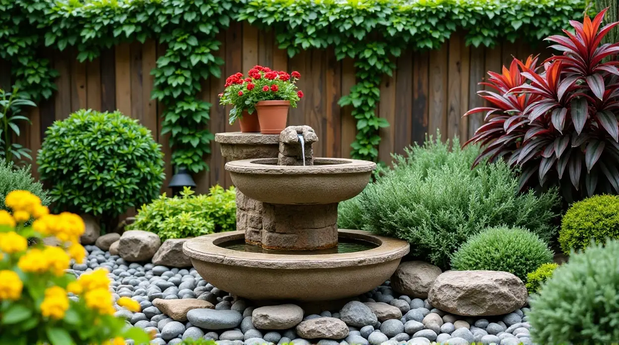 Nesta cena idílica de jardim, uma cascata de pedra lindamente trabalhada serve como peça central, criando um oásis de tranquilidade que cativa todos que entram. O som suave da água caindo estabelece um ambiente sereno, promovendo uma sensação de calma e conexão com a natureza.