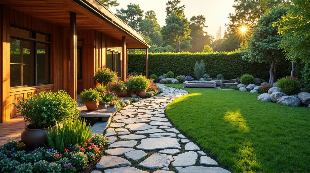 - Рассеянный солнечный свет создает теплое сияние, окутывающее всю территорию, мягко освещая траву, каменную дорожку и деревянные постройки. Эта игра света усиливает уютную атмосферу сада, идеально подходящую для моментов отдыха и размышлений.