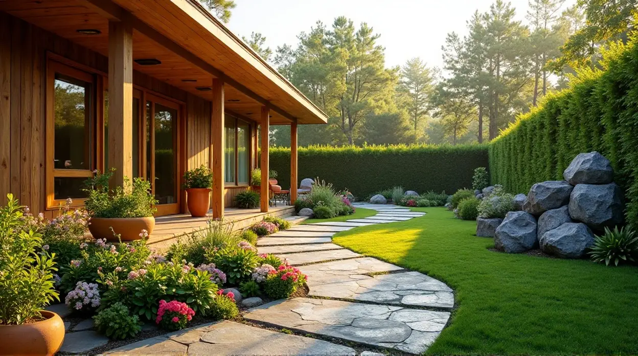 «Современный деревянный домик, окруженный живописными садами» — это идиллическая картина, где современный дизайн встречается с красотой природы. Извилистая каменная дорожка, пышная зеленая трава, аккуратно подстриженные кусты и яркие цветы в горшках создают в этом безмятежном саду атмосферу спокойствия, отдыха и наслаждения. Под лучами солнца, пробивающимися сквозь деревья, ландшафт превращается в тихое убежище, воспевающее симбиоз архитектуры и природы, что делает его идеальным местом для отдыха от повседневной суеты.