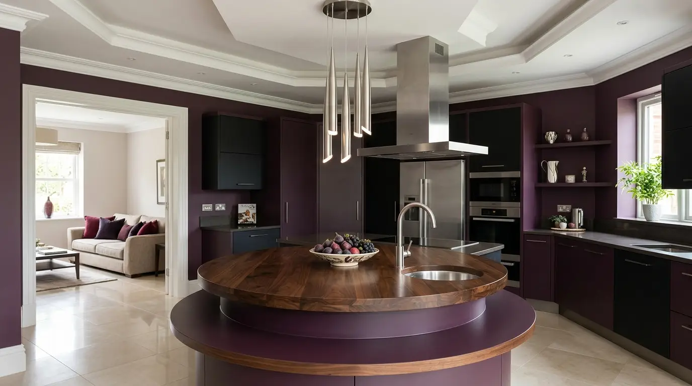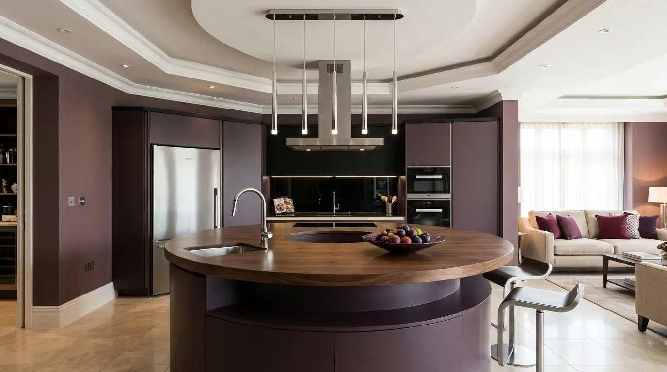 Сучасна кухня з круглим дерев’яним островом, вбудованою мийкою та вазкою з фруктами, оточена елегантними барними стільцями. Кімната оформлена в насичених фіолетових тонах, з побутовою технікою з нержавіючої сталі, включаючи холодильник та вбудовані духовки. На задньому плані видно затишну вітальню з диваном та подушками, що створює відкритий та привабливий простір.