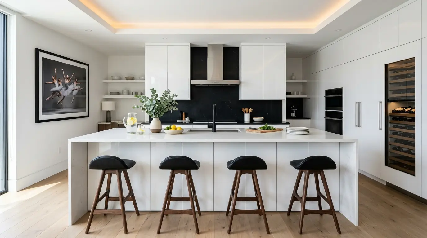 Сучасна кухня вирізняється елегантним білим островом із чотирма чорними стільцями, вазою із зеленню та мискою з лимонами. У кімнаті є мінімалістичні білі шафи, винний холодильник та стильний чорний фартух. Велика фотографія танцюристів у рамці прикрашає стіну, додаючи їй художнього шарму.