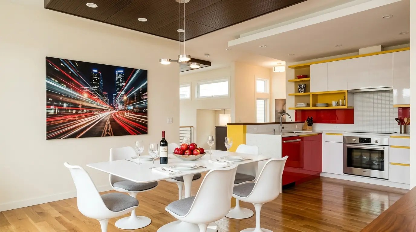Сучасна кухня та обідня зона вирізняються елегантним білим столом, оточеним стильними стільцями, на якому стоять келихи для вина та пляшка червоного вина. Миска з яблуками додає яскравого колориту. Кухонні шафки — це яскраве поєднання червоного, жовтого та білого кольорів, що доповнює побутову техніку з нержавіючої сталі. Стіну прикрашає динамічний міський пейзаж зі світловими слідами, що підкреслює сучасну атмосферу.