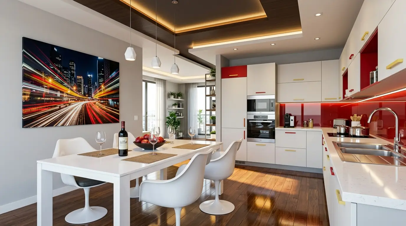 Сучасна кухня та обідня зона з елегантними білими шафами з червоними акцентами, глянцевим червоним фартухом та побутовою технікою з нержавіючої сталі. Білий обідній стіл з чотирма білими стільцями, на якому стоять келихи для вина та пляшка червоного вина. Стіну прикрашає яскравий міський пейзаж, а простір освітлено стильними підвісними світильниками та вбудованим стельовим освітленням.