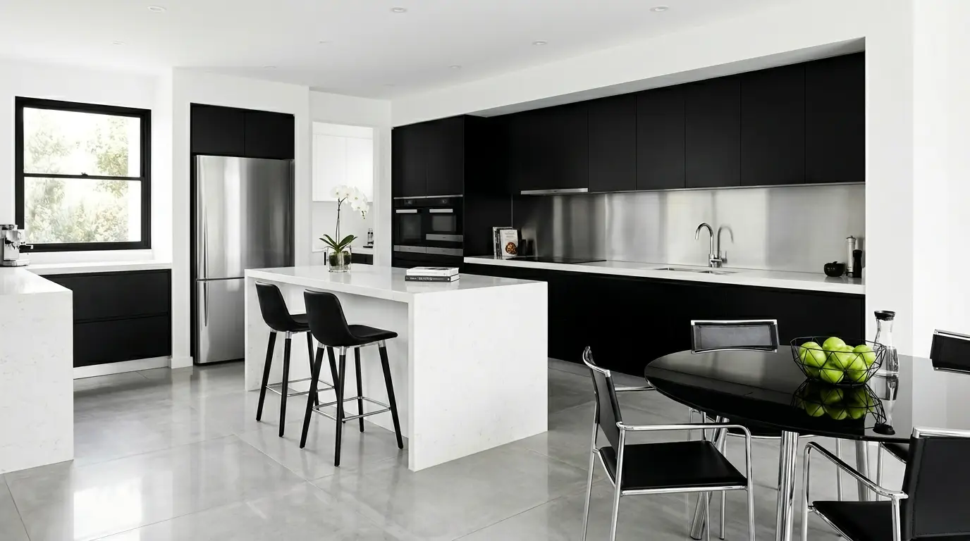 Сучасна кухня з елегантними чорними шафами та холодильником з нержавіючої сталі. Білий острів із чорними барними стільцями розташований посередині, а поруч – скляний обідній стіл із чорними стільцями в тон. Великі вікна пропускають природне світло, що підкреслює блискучу плиткову підлогу та зелені яблука у мисці на столі.