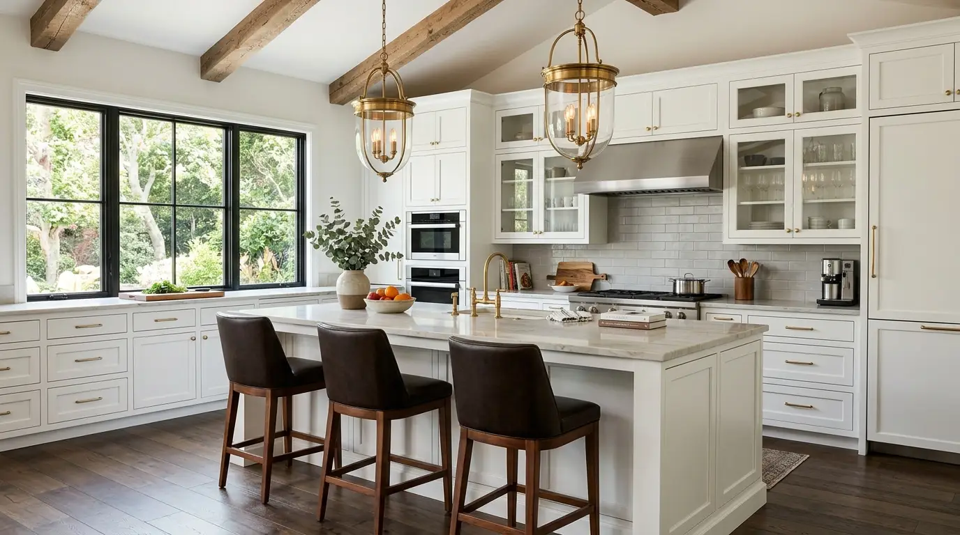 Якщо кухня — це серце дому, то ця б’ється у високій чіткості. ❤️ Це планування вражає ідеальним балансом між «ефективністю, готовою до роботи шеф-кухаря», та «затишком суботнього ранку». Балки з переробленої деревини додають сільської душі білим шафам, а це вікно? Воно фактично перетворює задній двір на живий витвір мистецтва. Кому потрібен фартух, коли відкривається такий краєвид? 🌿