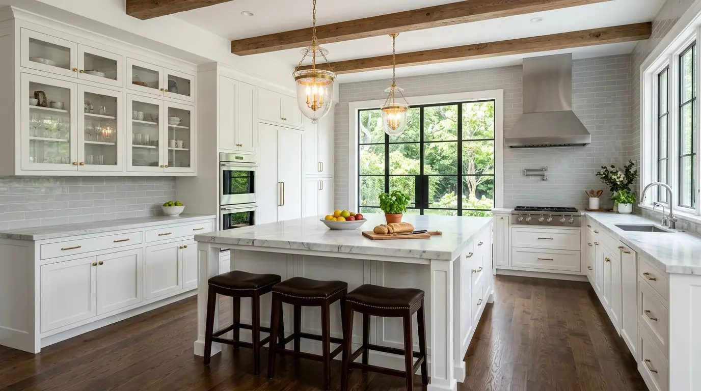 Сучасна кухня перехідного стилю з білими шафками-шейкерами, великим білим мармуровим островом-водоспадом, темними шкіряними барними стільцями, стельовими балками з переробленої деревини та масивним вікном з видом на зелений сад.