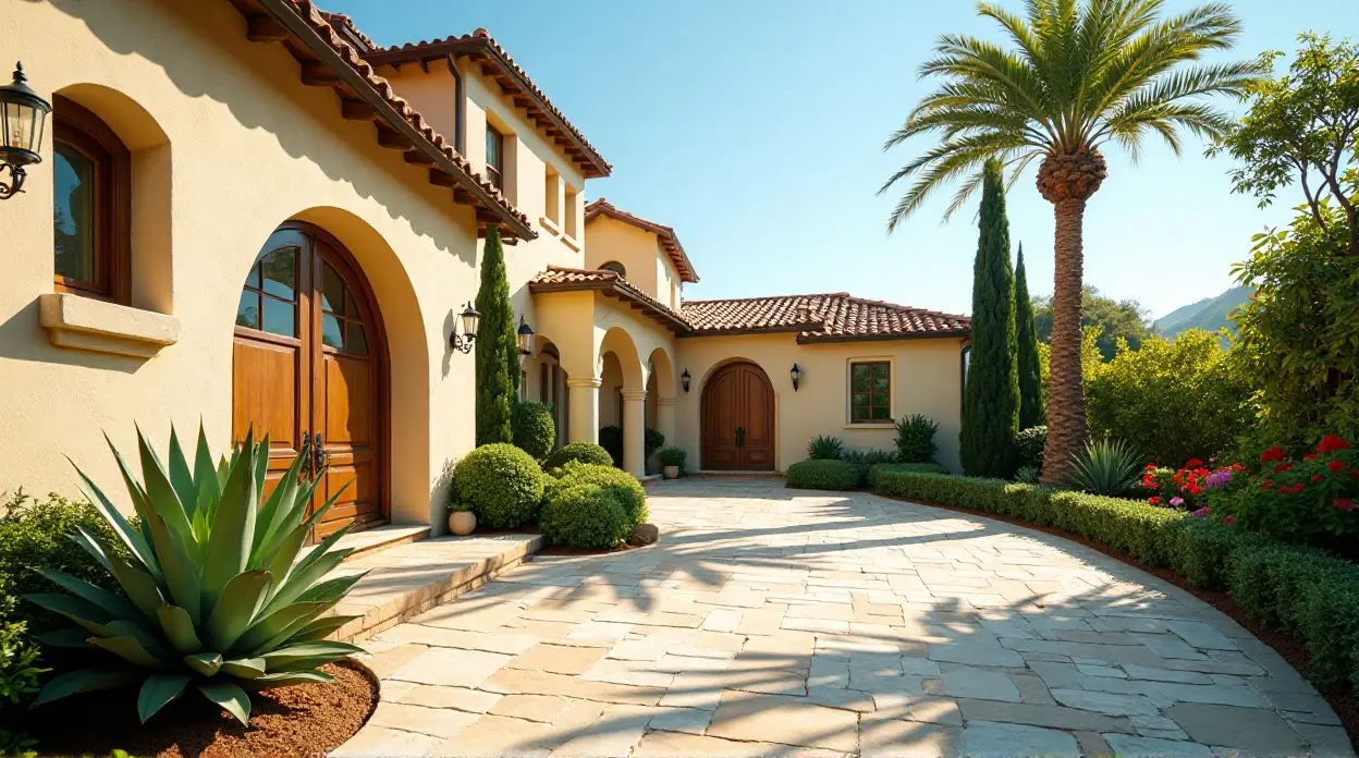 Будинок у середземноморському стилі має величні дерев’яні арочні двері, оточений високими кипарисами та доглянутими кущами. Зовнішній вигляд пофарбований у теплий бежевий тон з червоним черепичним дахом, а кам’яна доріжка обсаджена різноманітними рослинами, включаючи агаву та яскраво-червоні квіти.
